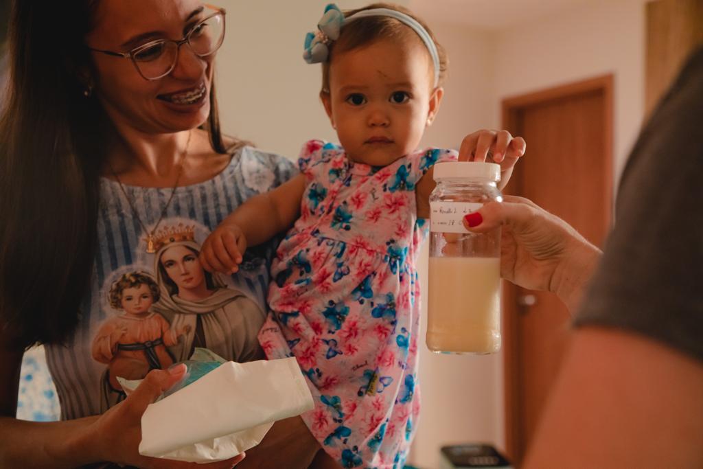 Junto da filha de 11 meses, toda sexta-feira Ranielly, de 24 anos, aguarda a equipe do Banco de Leite Humano Elaine Miriam de Oliveira para a doação em domicílio. Desde que a filha nasceu, ela é doadora fixa de leite materno para a unidade, contribuindo com a vida de crianças que precisam do alimento para sobreviver.