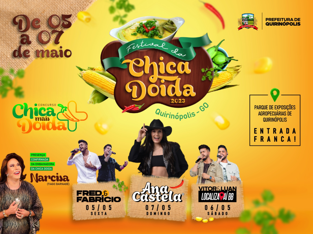 Neste final de semana, dias 5, 6 e 7 de maio, Quirinópolis será palco de mais uma edição do Festival da Chica Doida 2023. O evento, que se tornou tradição, vai celebrar a cultura e o prato patrimônio dos goianos com muitas atividades e shows gratuitos com Fred e Fabrício (dia 5), Vitor e Luan (dia 6) e Ana Castela (dia 7).Outra atração típica também confirmada é o concurso “A Chica Mais Doida”, que vai premiar com R$5 mil reais a melhor, mais criativa e, claro, deliciosa Chica Doida da festa. As inscrições vão até o dia 3 de maio.