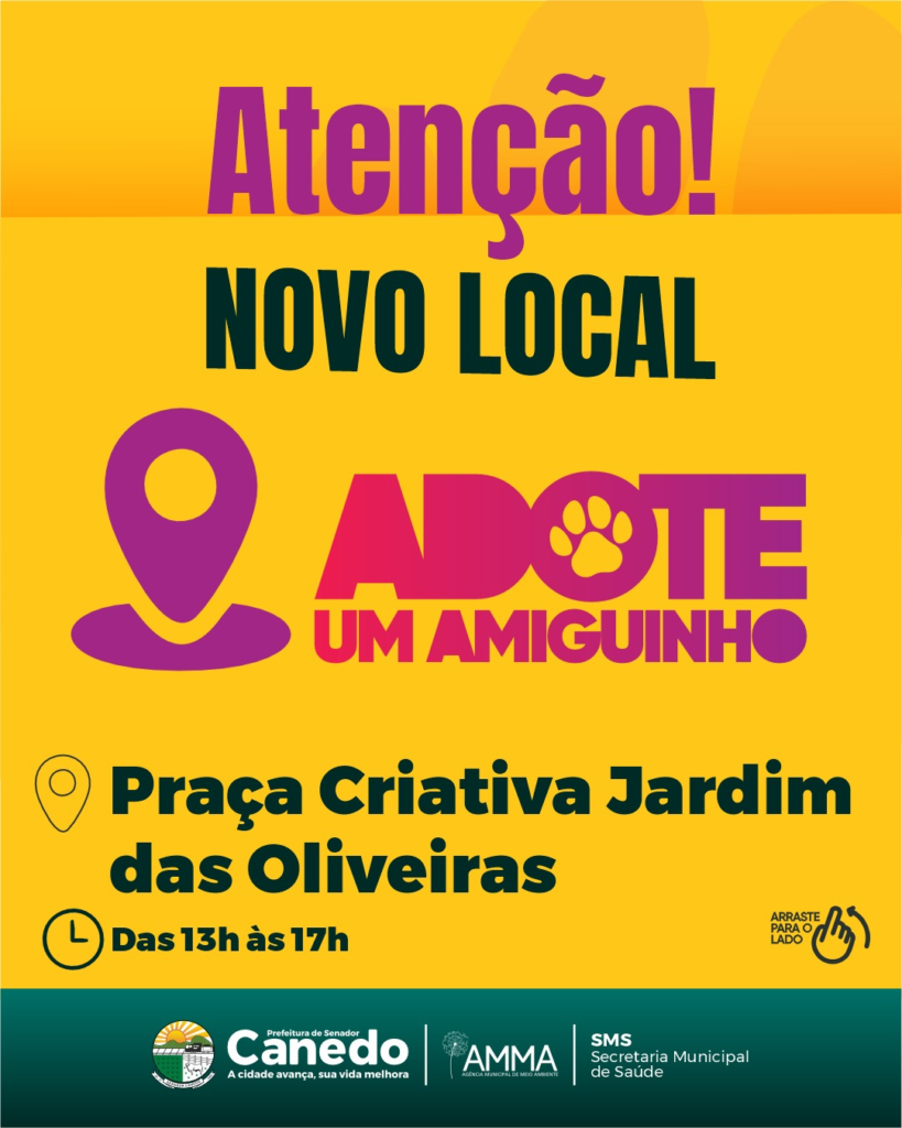 A Prefeitura de Senador Canedo por meio da Superintendência de Bem-Estar Animal realiza no próximo sábado, 28 de outubro, a quarta edição do “Adote um Amiguinho”. O evento que estava programado para o Parque do Setor Castros acontecerá na Praça Criativa do Jardim das Oliveiras, das 13h às 17h, e tem como objetivo incentivar a adoção responsável de animais abandonados ou que vivem em situação de vulnerabilidade.