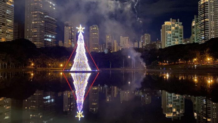 A Prefeitura de Goiânia celebra o Natal de 2023 com a terceira maior árvore flutuante do Brasil. A estrutura de 21 metros foi montada pela Companhia de Urbanização de Goiânia (Comurg) sobre uma balsa no lago do Parque Vaca Brava, no Setor Bueno.