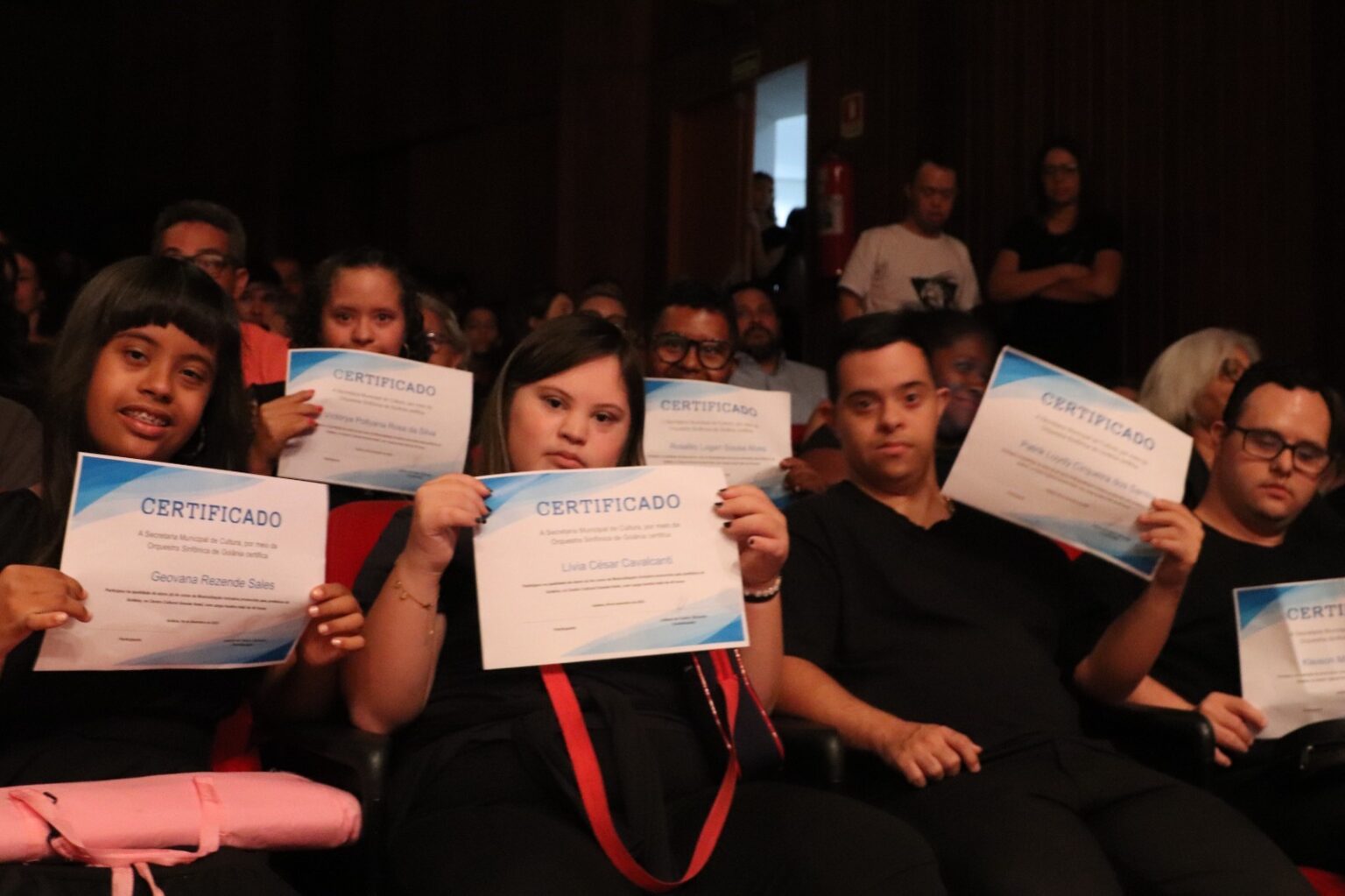 A Prefeitura de Goiânia, por meio da Secretaria Municipal de Cultura (Secult), promoveu na noite desta segunda-feira (4/12), no Teatro Goiânia, a 5ª Mostra Pedagógica da Rede Municipal de Núcleos Musicais da Orquestra Sinfônica de Goiânia, e certificou 174 alunos que participaram do curso de iniciação musical em flauta, violino, violão, viola clássica, canto, coral e acordeon. Do total de alunos, 12 deles têm Síndrome de Down e formam a turma de inclusão.