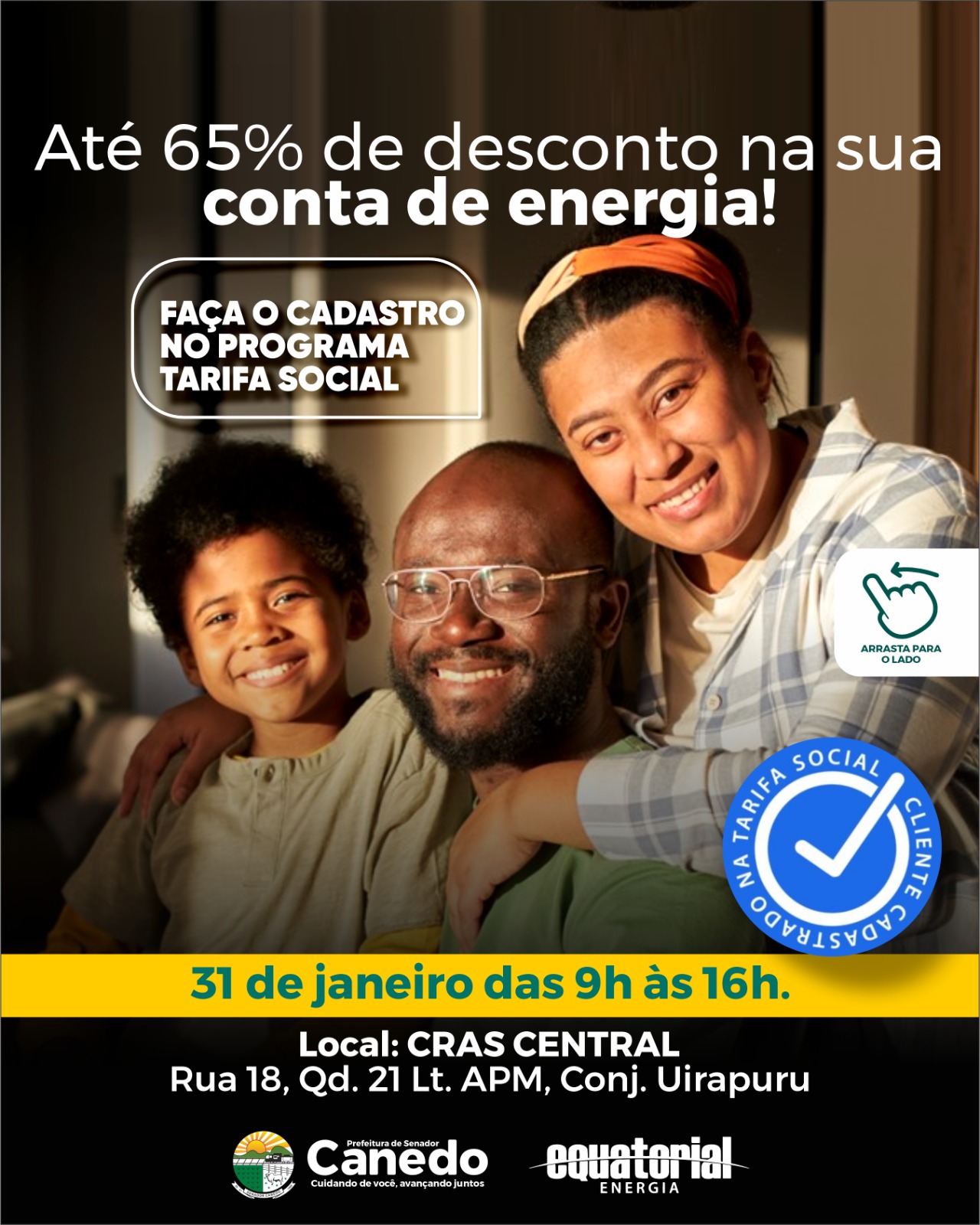 A Prefeitura de Senador Canedo em parceria com a Equatorial Goiás realiza o cadastramento no Programa Tarifa Social, que oferece descontos de até 65%, na conta de energia dos moradores do município. A ação acontece no próximo dia 31 , das 9h às 16h no CRAS Central, localizado na Rua 18, Quadra 2, Lote APM, Conjunto Uirapuru.