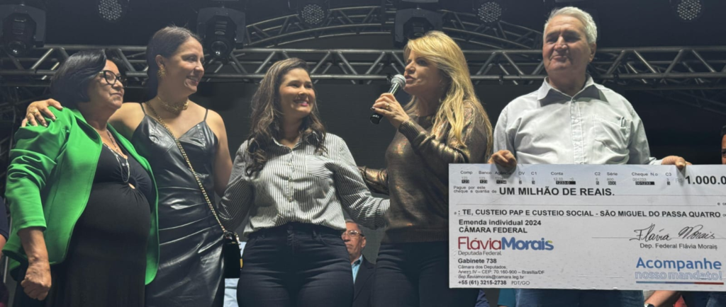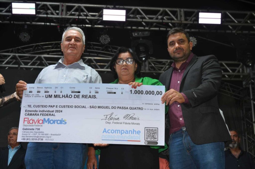 Deputada federal Flavia Morais, entrega ao prefeito Gilmar Pereira, um cheque no valor de um milhão de