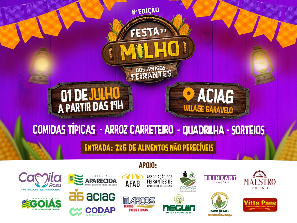 Aparecida de Goiânia sedia nesta segunda-feira, 1º de julho, a partir das 19h, a 8ª edição da Festa do Milho dos Amigos Feirantes. O evento, voltado para os feirantes da cidade, será realizado na Associação Comercial e Industrial de Aparecida de Goiânia (ACIAG) e contará com música ao vivo, sorteios e uma variedade gastronômica de comida típica de festa junina, além do tradicional arroz carreteiro.