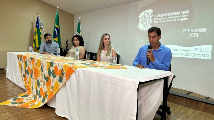 O gari Fábio Rodrigues de Sousa, de 42 anos, que é cego e psicólogo, participou do Seminário “Deficiência Visual: um olhar além do estigma”. O evento, realizado pela Universidade Federal de Goiás, foi realizado na noite desta quarta-feira (27/11), no Setor Universitário. Fábio contou sua vivência como profissional e inspirou os novos formandos da instituição.