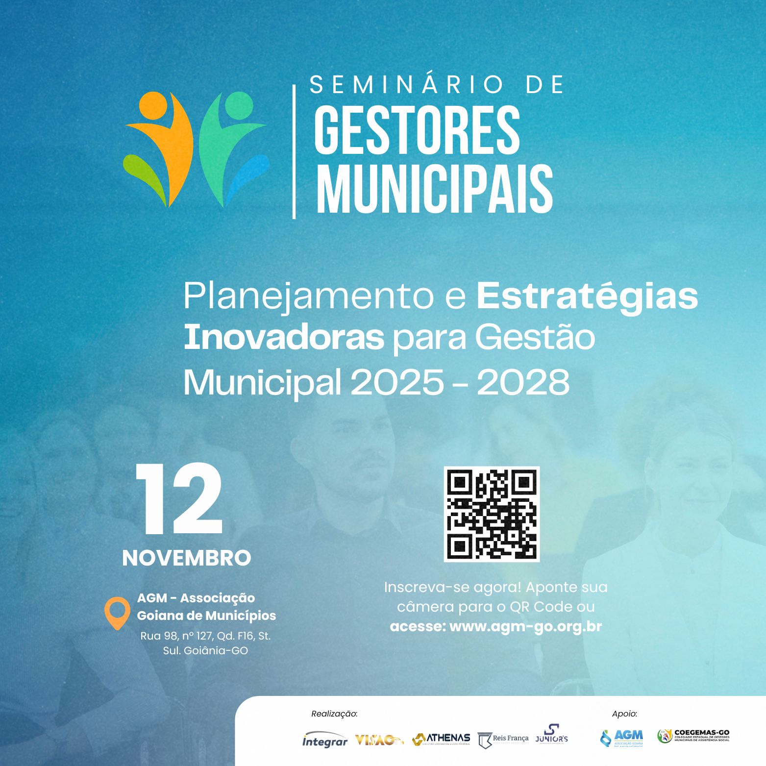 Importante evento acontece no dia 12 de novembro tendo como público alvo prefeitos(as) eleitos(as) e reeleitos(as), primeiras damas, secretários(as) de assistência social, controladores internos, assessores e responsáveis pelo Departamento de Patrimônio. É o seminário Gestores Municipais – Planejamento e Estratégias Inovadoras para Gestão Municipal 2025/2028. O evento é promovido pela Integrar, Visão, Athenas Consultoria Governamental, Reis França Advogados Associados e Junior’s Consultoria & Treinamentos com o apoio da AGM, Coegemas e Megasoft.