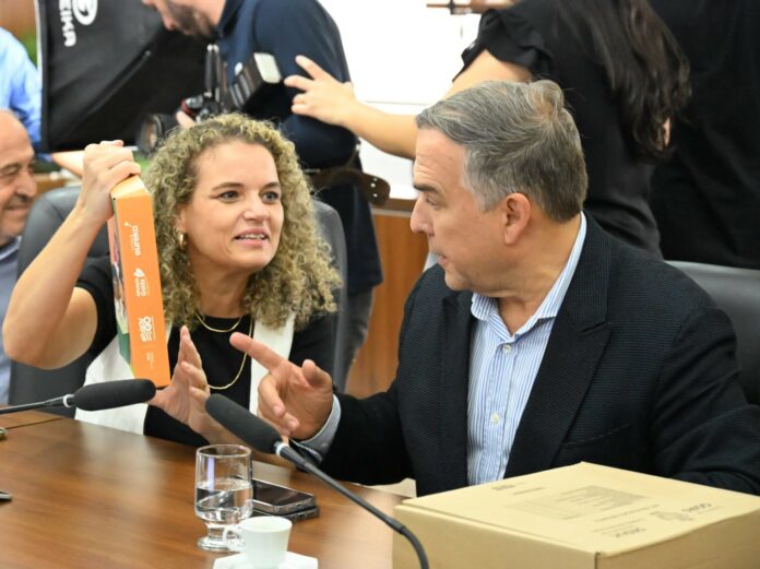 Durante o evento, a prefeitura de Goiânia recebeu, de forma simbólica, kits escolares, entregues pelo governador Ronaldo Caiado e pela secretária de Educação de Goiás, Fátima Gavioli.