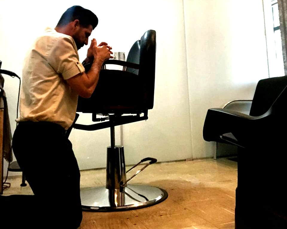 Willian Ribeiro: em um ato de fé e humildade, busca em oração a orientação para seguir com força, foco e coragem. Sua cadeira de barbeiro, testemunha silenciosa dessa conexão, representa o lugar onde seus sonhos são cultivados. Uma foto capturada com carinho por um amigo.