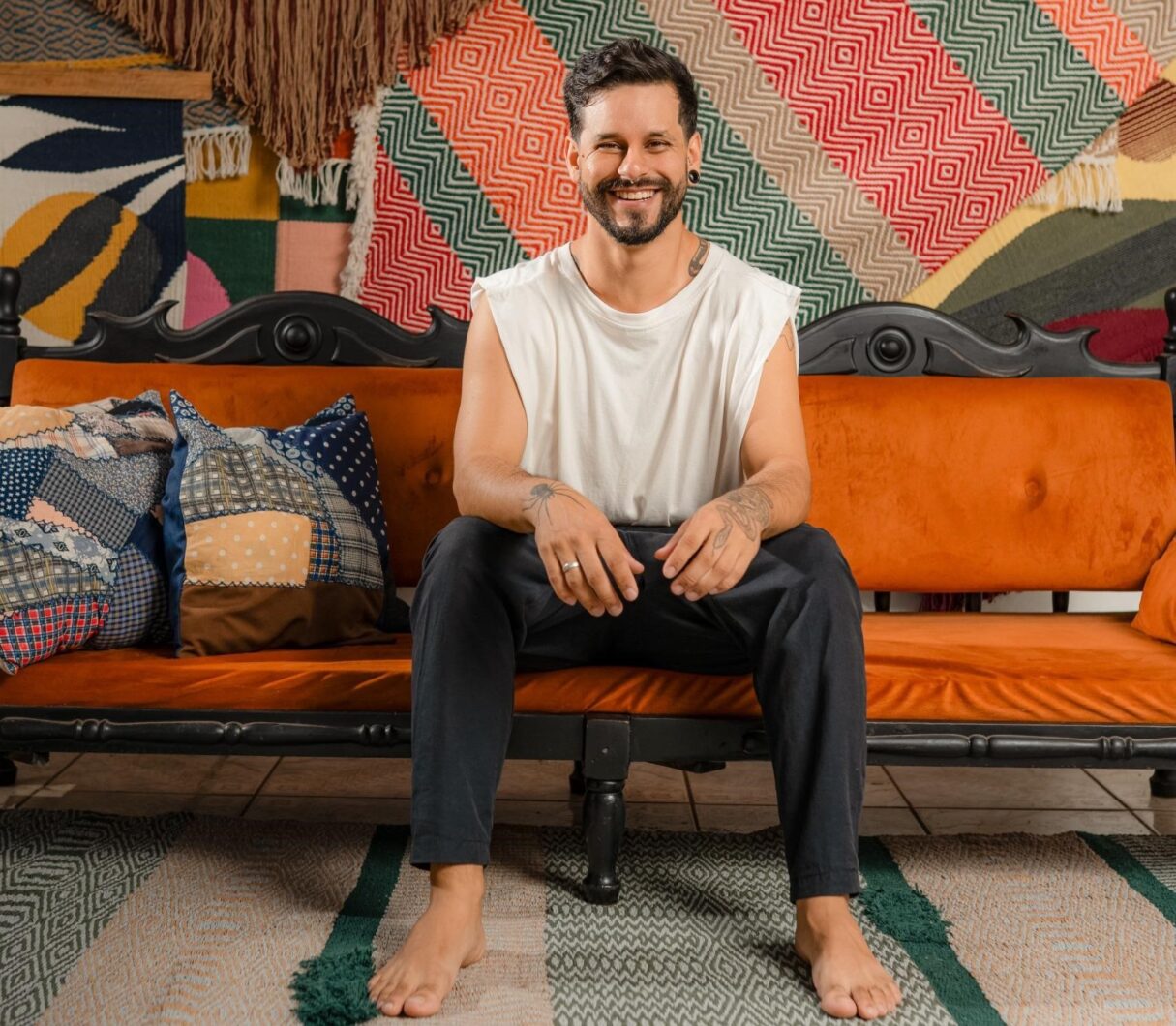 Joaquim Gardino é designer de interiores e tecelão autodidata. Formado em Design de Interiores pela Unip em 2019, iniciou sua jornada têxtil no ano seguinte, explorando os primeiros fios com um tear de pente-liço.