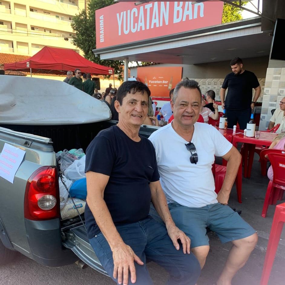 Joaquim e o amigo Nelson (Padrinho), na recepção do ponto de coleta de alimentos, estão felizes pelo resultado. Este registro fotográfico foi realizado no evento de 2023, no Yukatan Bar. Oportunidade em que o veículo Montana se transformou em local de coleta de alimentos.