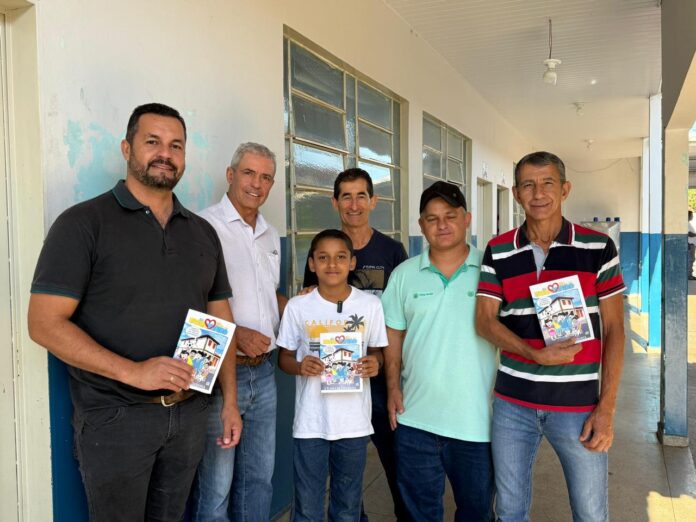 O Presidente Guilherme Calixto, vereadores, o diretor da escola e um aluno representam o sucesso da campanha de entrega da cartilha educativa “A Turma da Cidadania” nas escolas do município.