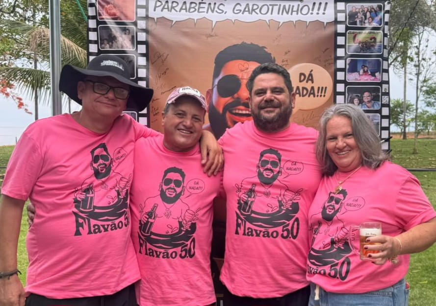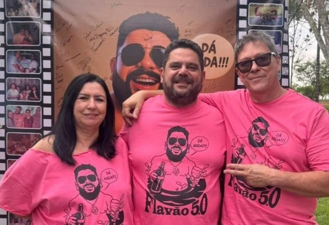 Os detalhes da festa refletiram o carinho dos amigos. Na entrada, um banner com a caricatura irreverente criada pelo cartunista ANÍSIO SERRAZUL dava as boas-vindas. Em seguida, todos receberam uma camiseta comemorativa, desenvolvida pela Tribo Tropical, grife dos amigos e empresários WELINGTON OLIVEIRA e NÚBIA MIRANDA (pais do genro de Flávio, o estudante de Direito VYNNICIUS MATOS). Em um gesto de conscientização, a camiseta, que estampava a caricatura, tinha a cor rosa, em referência ao Outubro Rosa, campanha de alerta sobre a prevenção e diagnóstico precoce do câncer de mama e de colo do útero.