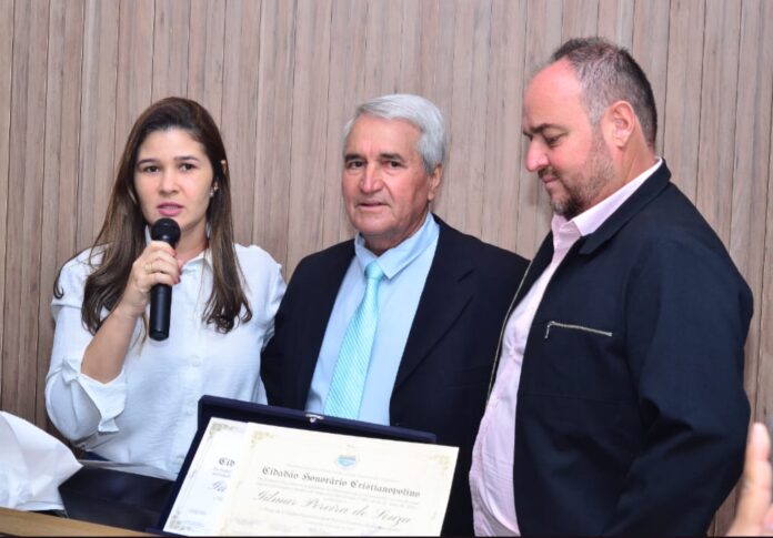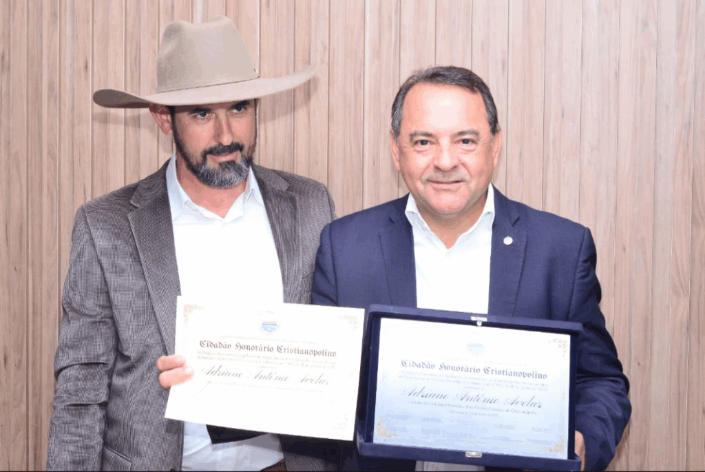 Cristianópolis, GO – Em um evento que celebrou a união e a força do municipalismo, o Prefeito de São Miguel do Passa Quatro, Gilmar Pereira de Souza, foi solenemente agraciado com o Título de Cidadão Honorário José Pereira Faustino pela Câmara Municipal de Cristianópolis. A honraria, entregue durante a 2ª Sessão Solene na noite de quinta-feira (23/10/2025), é um reconhecimento à atuação de Gilmar, que se destaca por construir pontes de cooperação em toda a região.O título foi uma iniciativa do vereador Paulo Ribeiro Lemes, cuja proposta enfatizou a relevância da atuação de Gilmar no cenário regional. O vereador Lemes destacou que a homenagem celebra não apenas um líder, mas um modelo de gestão pautado pela colaboração e parceria, que beneficia diretamente a população de Cristianópolis e das cidades vizinhas.
