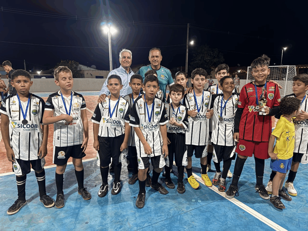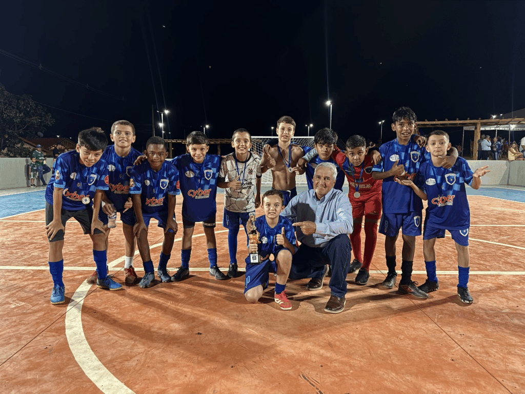 As duas primeiras equipes, formadas por jovens e talentosos atletas locais, celebram a conquista e o espírito esportivo. A presença do Prefeito Gilmar Pereira (também nas fotos) reforça o apoio ao esporte e à juventude da cidade. Parabéns a todos os participantes! Que venham muitos outros campeonatos e momentos de alegria na nova quadra!