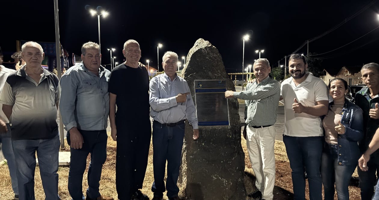 Prefeito Gilmar, acompanhado de autoridades municipais e moradores, em frente à pedra fundamental que registra essa importante conquista para a comunidade. A nova praça é um espaço de lazer e convivência que promete trazer mais qualidade de vida para todos.